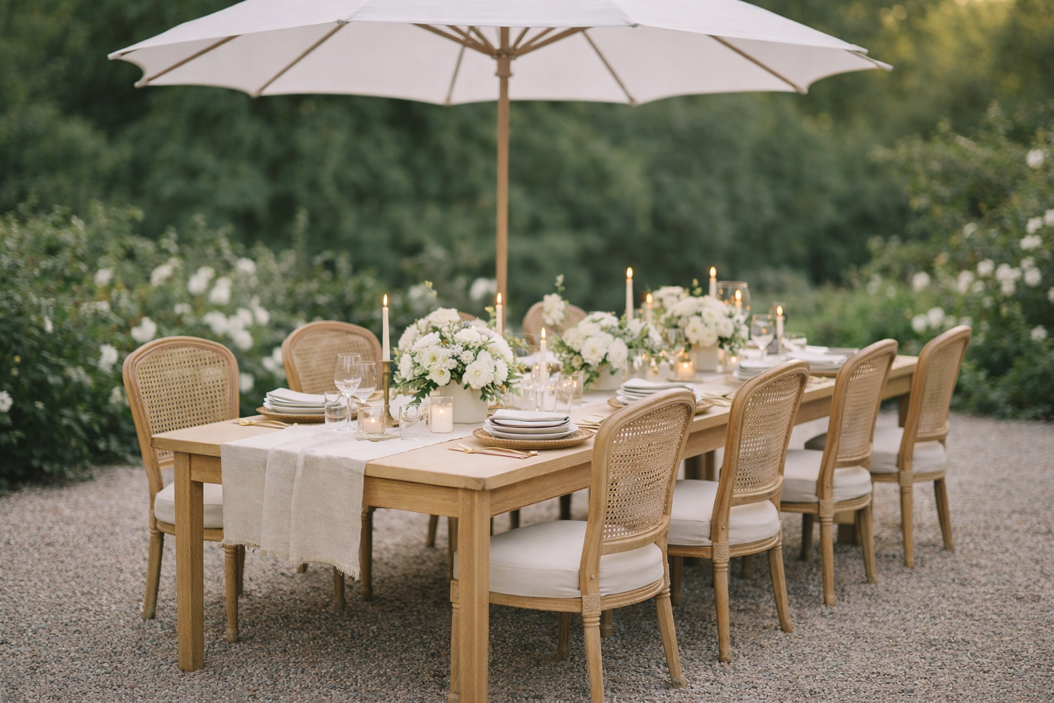 We offer thoughtfully curated tables, chairs, umbrellas, and tablescapes—designed to create clean, beautifully composed event settings that feel both elevated and effortless.